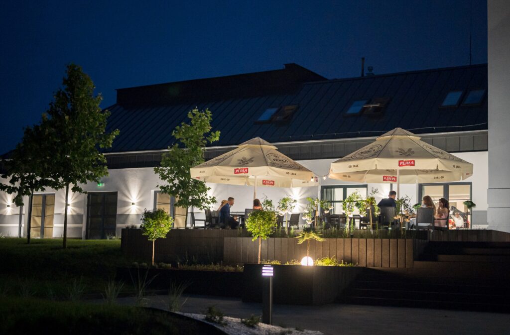 Wokół Hotelu znajdują się duże tarasy, które w trakcie letnich miesięcy są doskonałym miejscem na spędzenie czasu na świeżym powietrzu, na łonie natury. Na tarasach dostępny jest bezpłatny Internet Wi-Fi oraz zasilanie elektryczne, co umożliwia pracę i realizowanie obowiązków służbowych.